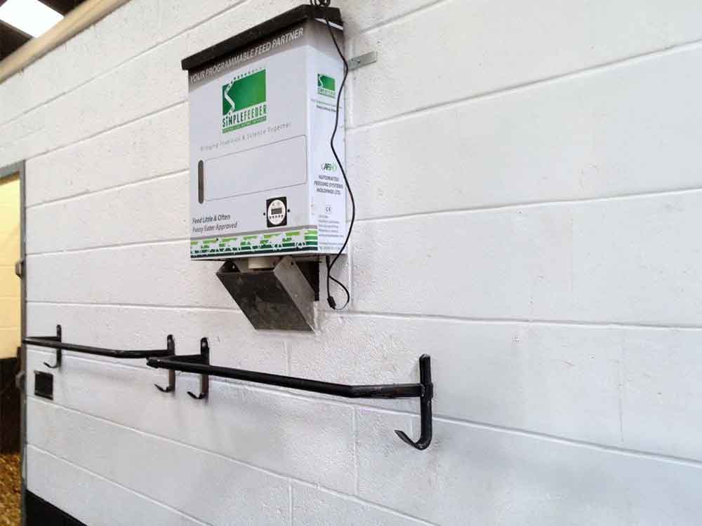 Der Futterautomat ist witterungsbeständig und widersteht den Streichen der Pferde.